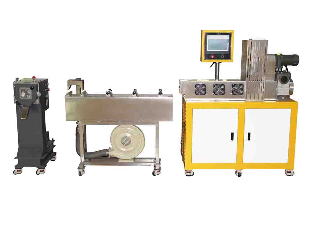 本機(jī)主要由主驅(qū)動(dòng)電機(jī)、傳動(dòng)裝置、擠出裝置、加料斗、電控系統(tǒng)、模頭等組成.其工作原理為:物流從料斗里放入經(jīng)過擠出裝置的塑化和擠出變?yōu)榱餮訝顟B(tài),再從主機(jī)經(jīng)模頭出來,擠出機(jī)組的用途不同其選配用的輔助設(shè)備也不盡相同。